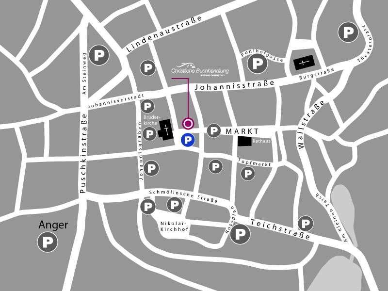 Mitten in der Altstadt am oberen Ende des Altenburger Marktes, befindet sich unser Ladenlokal direkt gegenüber der Brüderkirche, die das Ensemble dominiert. Parkplätze sind unmittelbar vor der Buchhandlung.