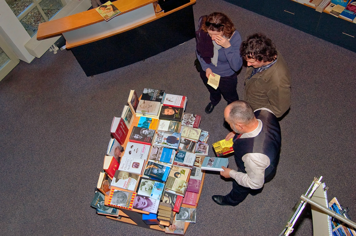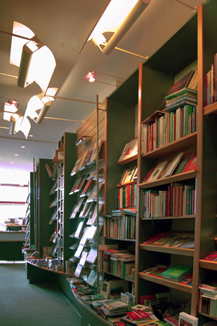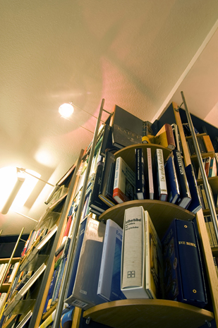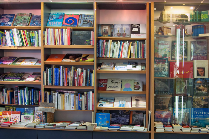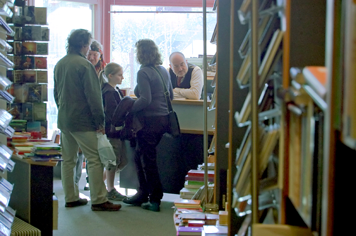Helle, lichte Architektur. Ein schmaler Raum, der sich ungeahnt weit öffnet und den Blick freigibt auf unzählige Bücher, sortiert, gestapelt, nebeneinander gereiht, zum Greifen nah die verlegerische Vielfalt. Pfeifentabak in der Luft. Es wird bereits gelesen, was soeben ausgepackt ist.
